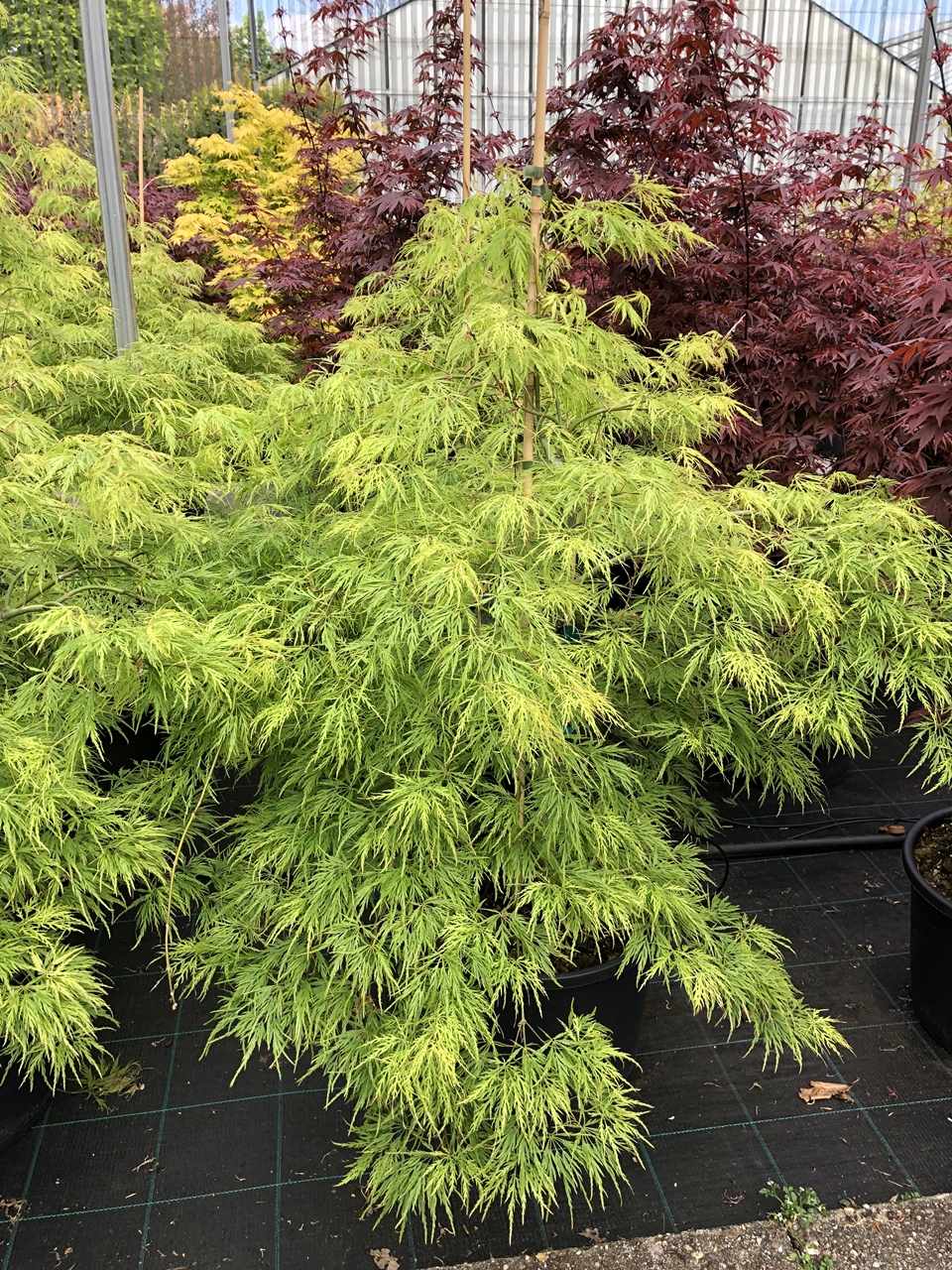 Die Sorte Acer palmatum 'Dissectum' wächst als kleiner, gedrungener, flacher bis halbkugeliger Strauch, der bis zu 2 m hoch und dann oft 2 bis 3 m breit wird. Der Mittelstamm und die Hauptäste wachsen malerisch geschwungen. Wie alle japanischen Ahorne zeichnet er sich durch sein ausgesprochen schönes Aussehen aus und eignet sich daher eignet besonders gut zur Einzelstellung. Die frischgrünen Blätter sind tief und fein geschlitzt; 5- 7-lappig. Dieser grüne Schlitzahorn ist im Sommer grün und im Herbst färbt sich sein Laub leuchtend gelb-orange. Im Winter ist der Ahorn blattlos. Er ist anspruchslos und pflegeleicht, jedoch im jungen Alter leicht frost- empfindlich. Der grüne Schlitzahorn bevorzugt leicht saure, feuchte und durch- lässige Böden ohne Staunässe in halbschattigen und möglichst etwas geschützten Lagen.