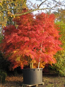 Acer palmatum ist ein baumartiger Großstrauch. Dieser malerische Strauch bildet oft mehrere Stämme und hat eine rundliche Krone, die im Alter schirmartig übergeneigt wächst. Seine frischgrünen Blätter sind in der Regel bis über die Blattmitte einge- schnitten und haben eine leuchtend orange bis rote Herbstfärbung. Im Mai sind purpurrote, kleine Trugdolden zu sehen. Dieser langsam wachsende Strauch wird 5 bis 7 m hoch und breit. Ein halbschattiger und nicht zu trockener Standort mit einem durchlässigen, frischen, humosen Boden ist optimal. Eine geschützte Lage wäre angebracht, da er in der Jugend etwas frostgefährdet ist. Verwendet wird er als Solitärgehölz für Gärten und Parks. Er passt sehr gut für das japanische Gartenthema.